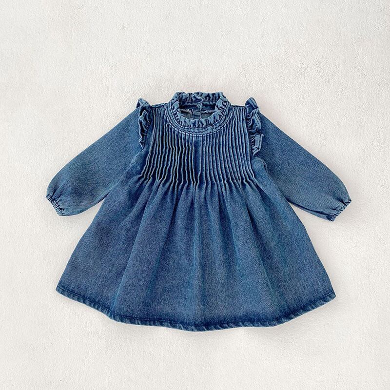 春新作 ガールズ 韓国風子供服 ワンピース デニム フリル ワンピ 73-110cm