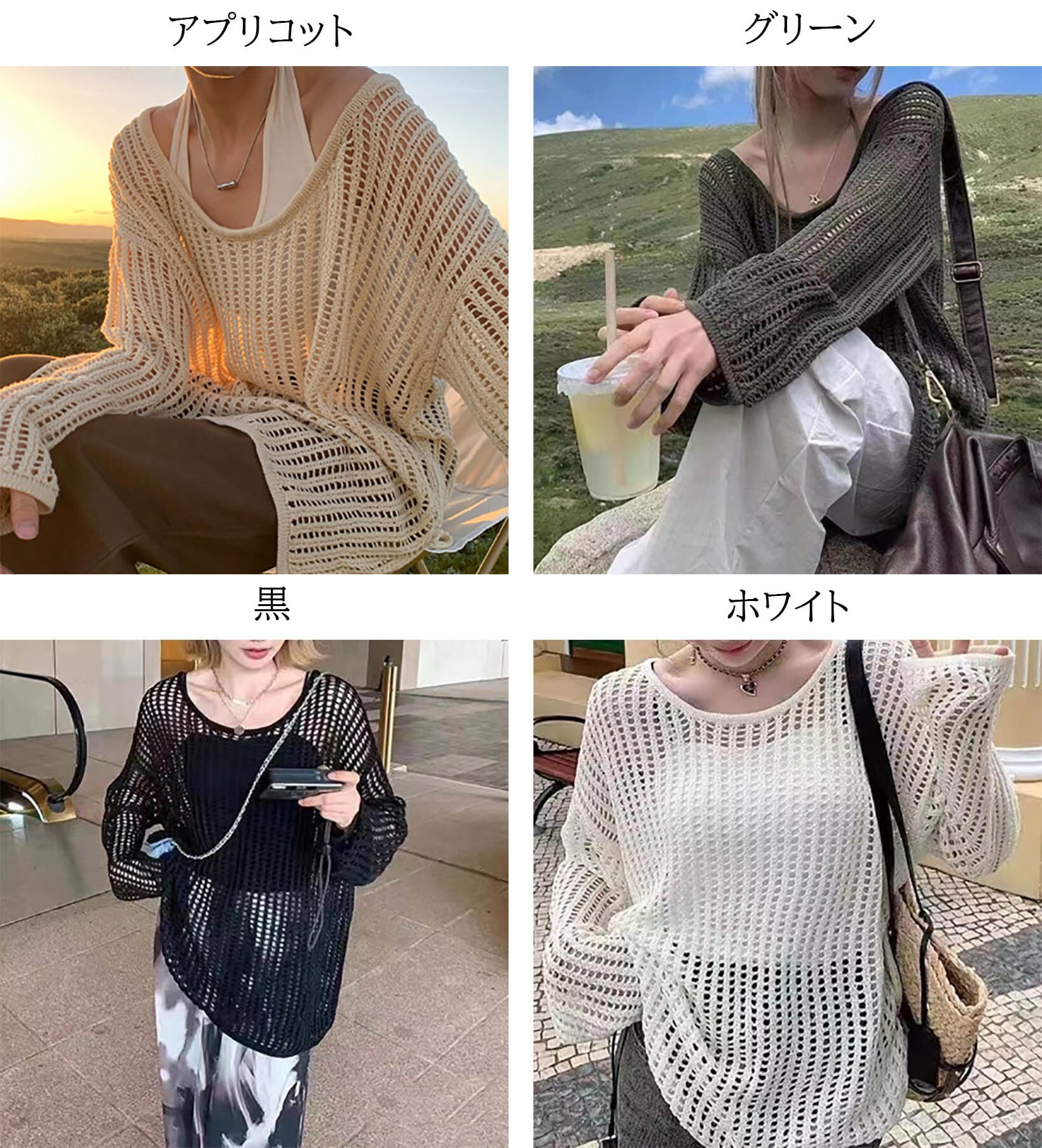 ・透け感のある爽やかな緩いシルエットの 透かし編みニットです。 ・タンクトップやキャミソールなどに重ねて着るだけで、今年っぽいレイヤードスタイルを楽しめます。