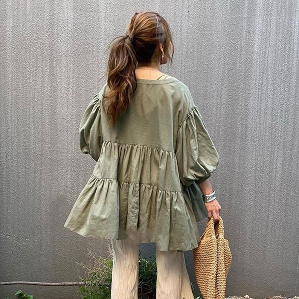 ブラウス 人気シャツ ラウンドネック 両面着 体型カバー フレア レディーストップス 全7色