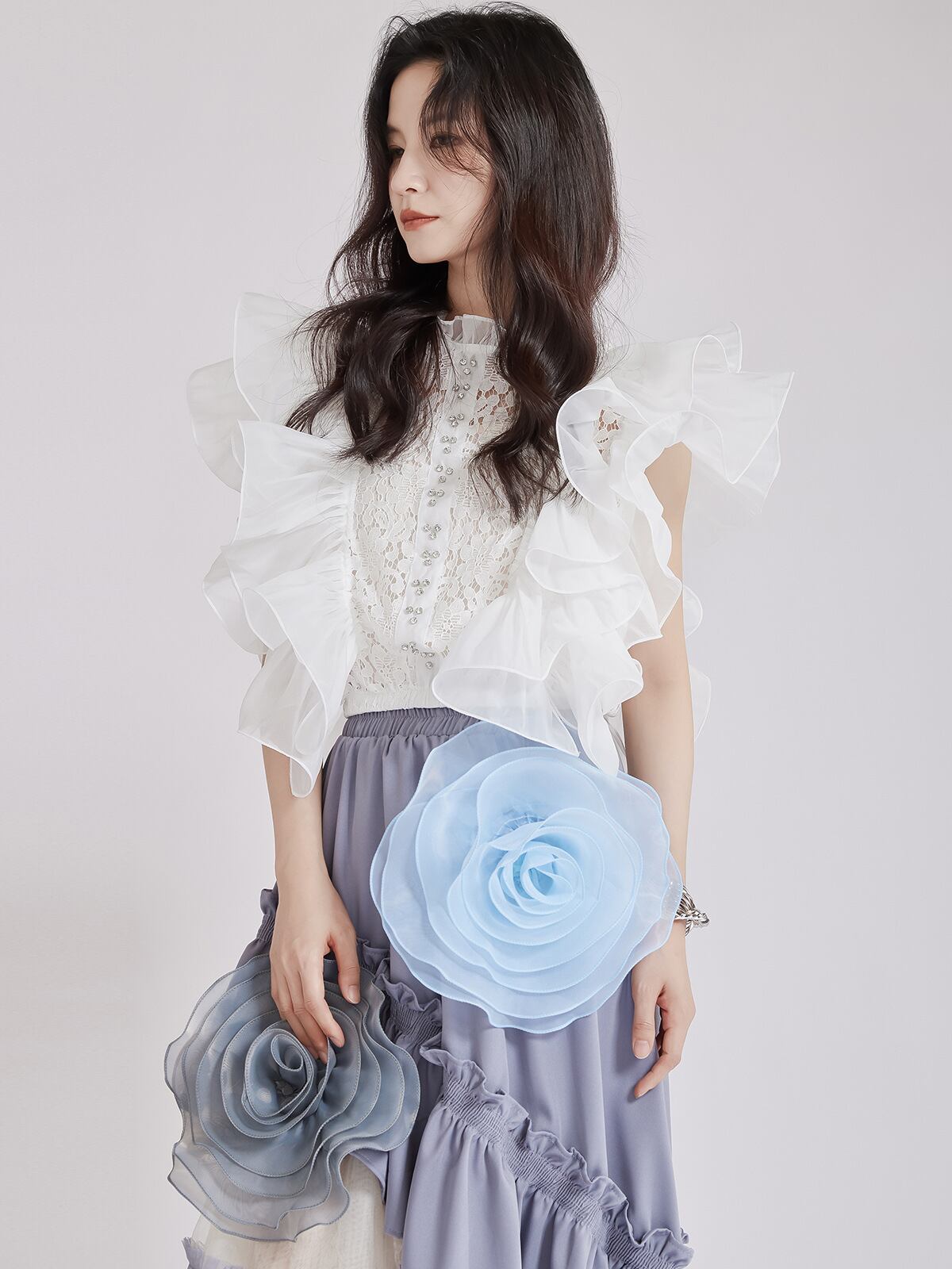個性的オシャレレースフリル切替スタンドネックブラウスレディース
