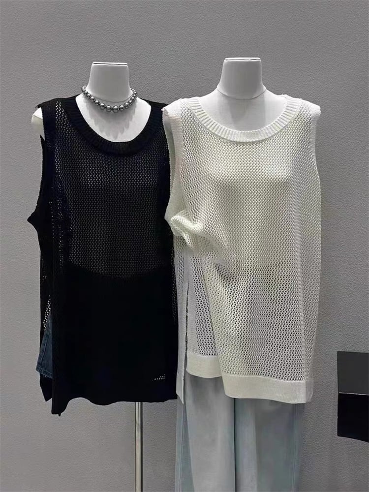 コーデに輝きを添える 夏 UVカット オフィスカジュアル用 丸首 サイドスリット ゆったり ミディアム丈
