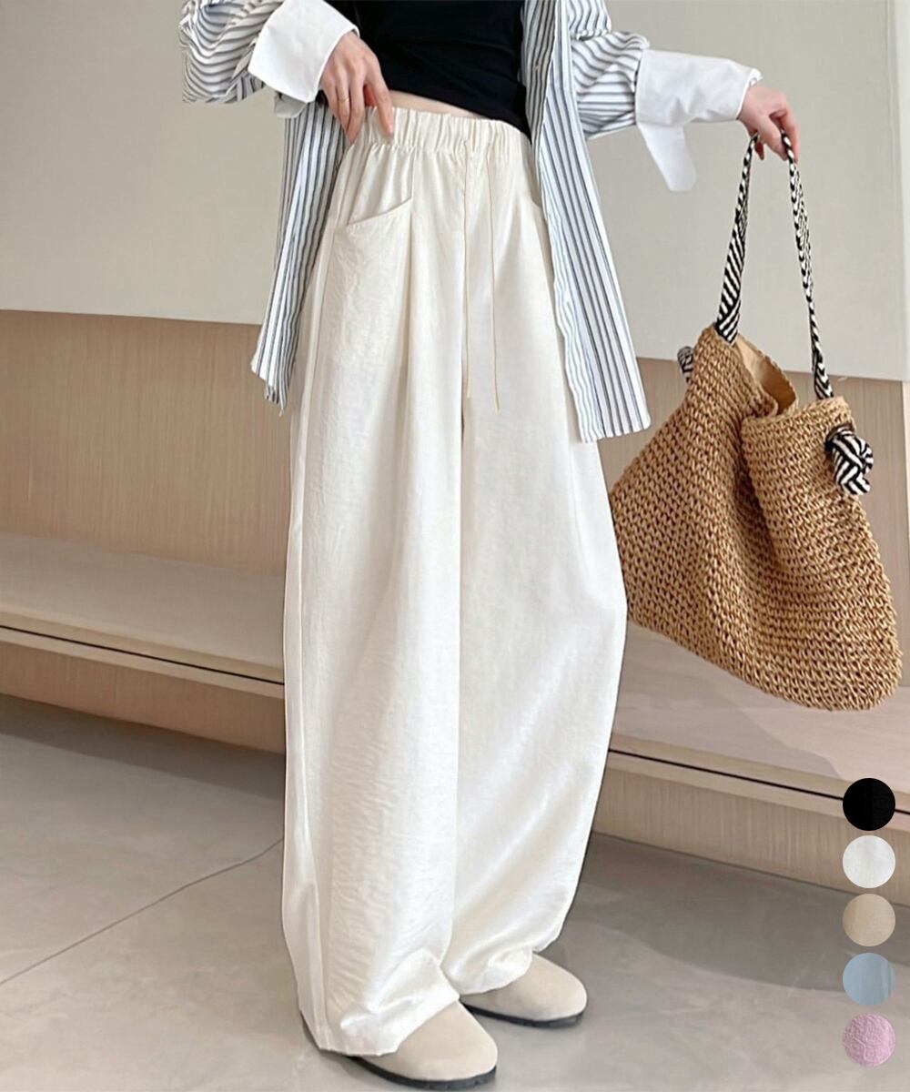 ウエスト総ゴムと紐付き仕様で穿きやすいワイドパンツ