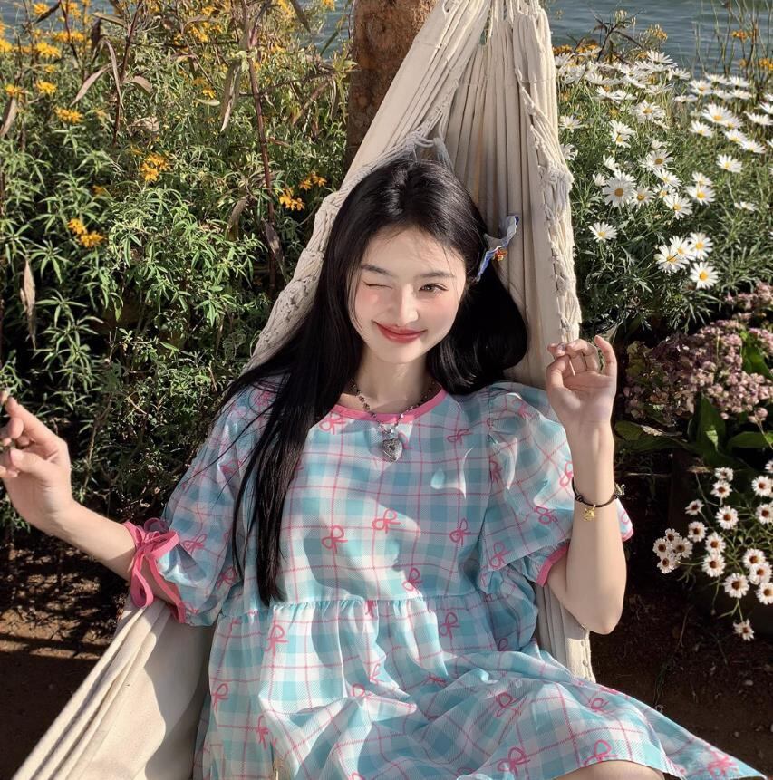 女 レディース 半袖 チェック柄 ミニ ワンピース ドレス 台型スカート
