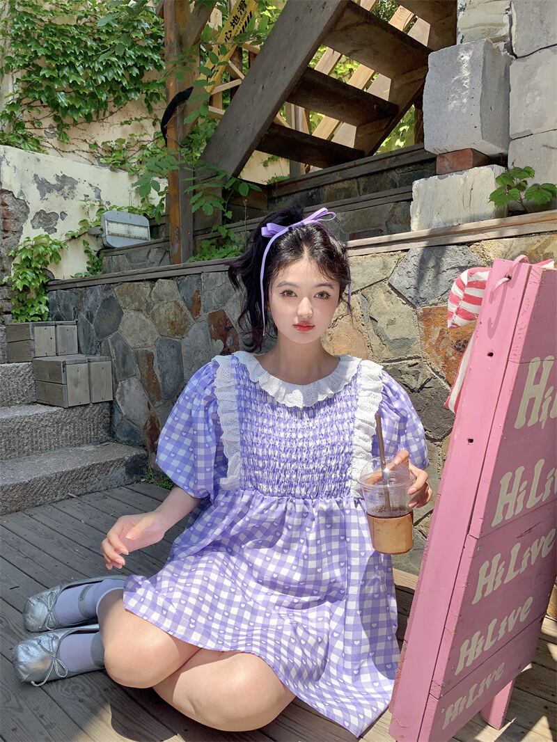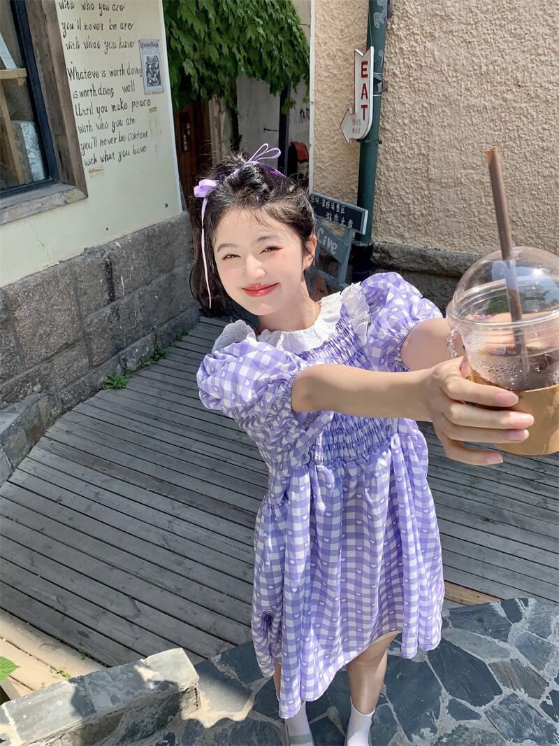 2025春夏新作 女 レディース 半袖 チェック柄 ミニ ワンピース ドレス 台型スカート