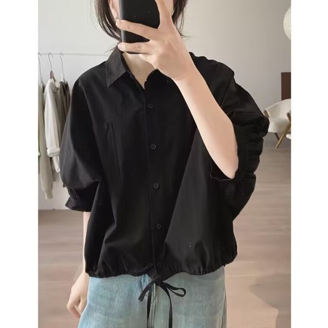 レディース シャツブラウス トップス 体型カバー 着痩せ フロント紐 おしゃれ プルオーバー 7分袖