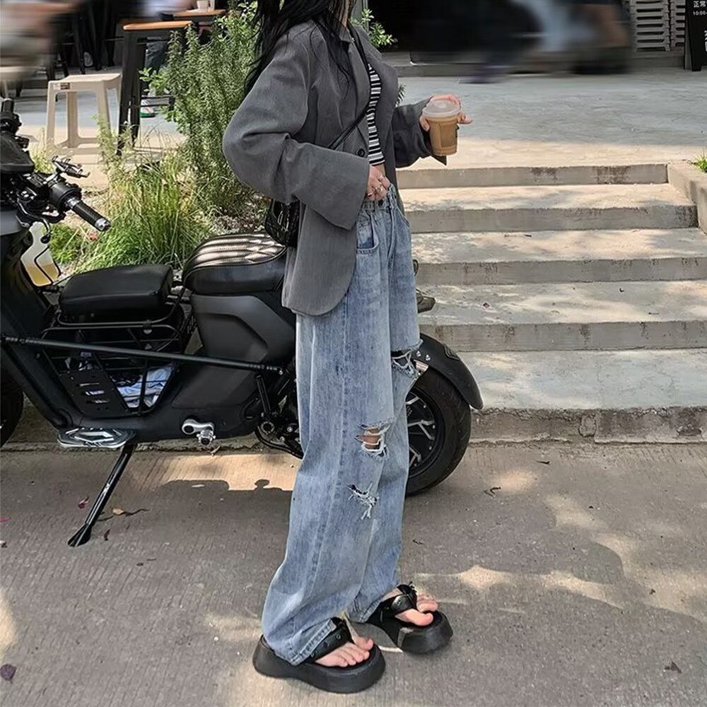 韓国ハイウエスト カジュアル ストレートジーンズ クラッシュデニムパンツ ウォッシュ加工 ストリート ジーパン おしゃれ