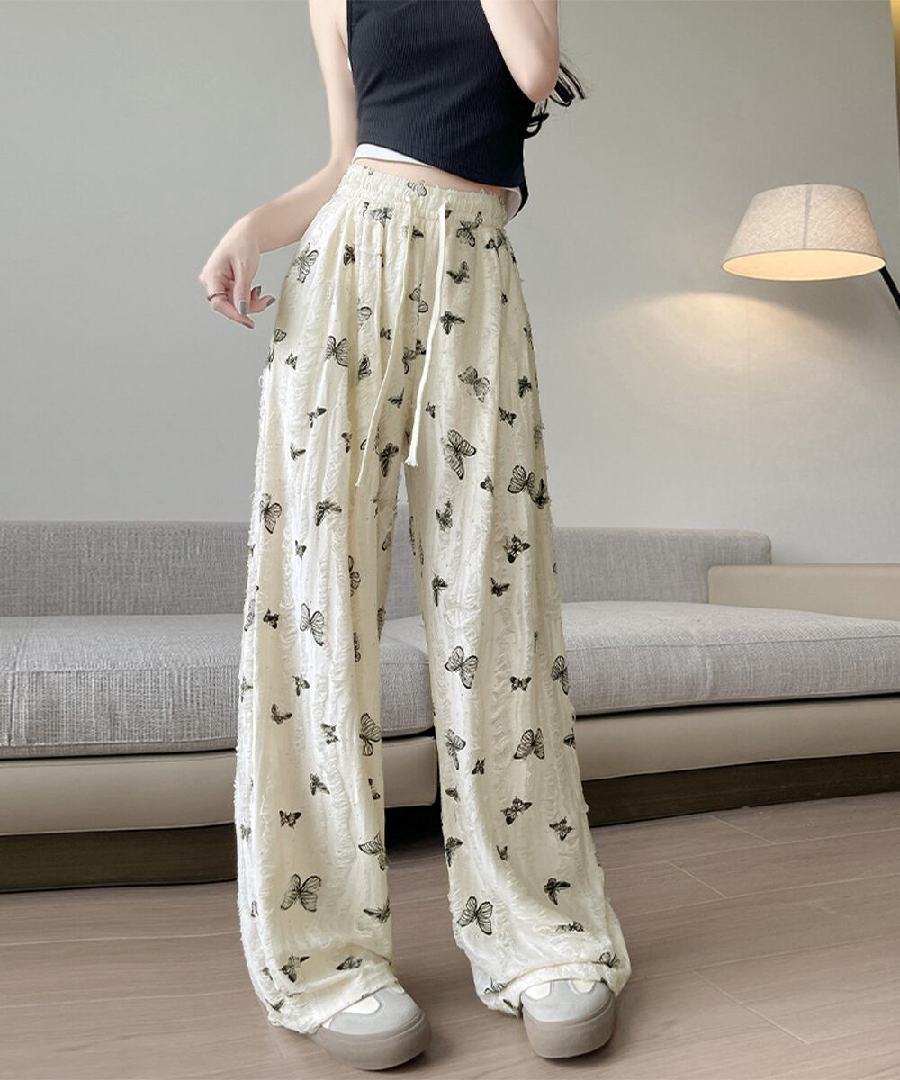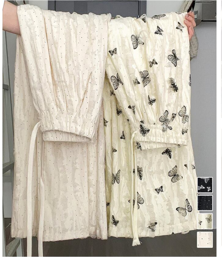 蝶柄ワイドパンツ ダメージロングパンツ夏