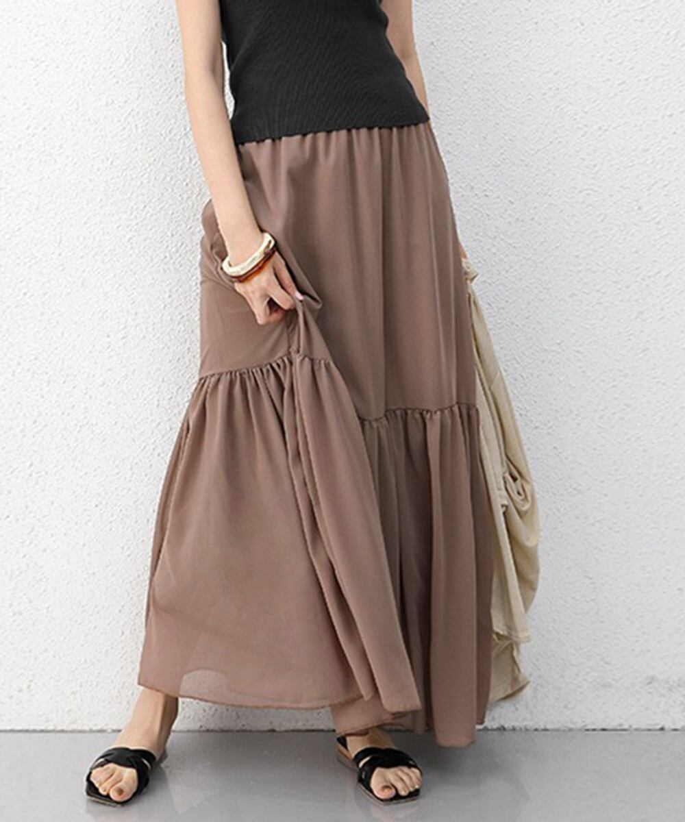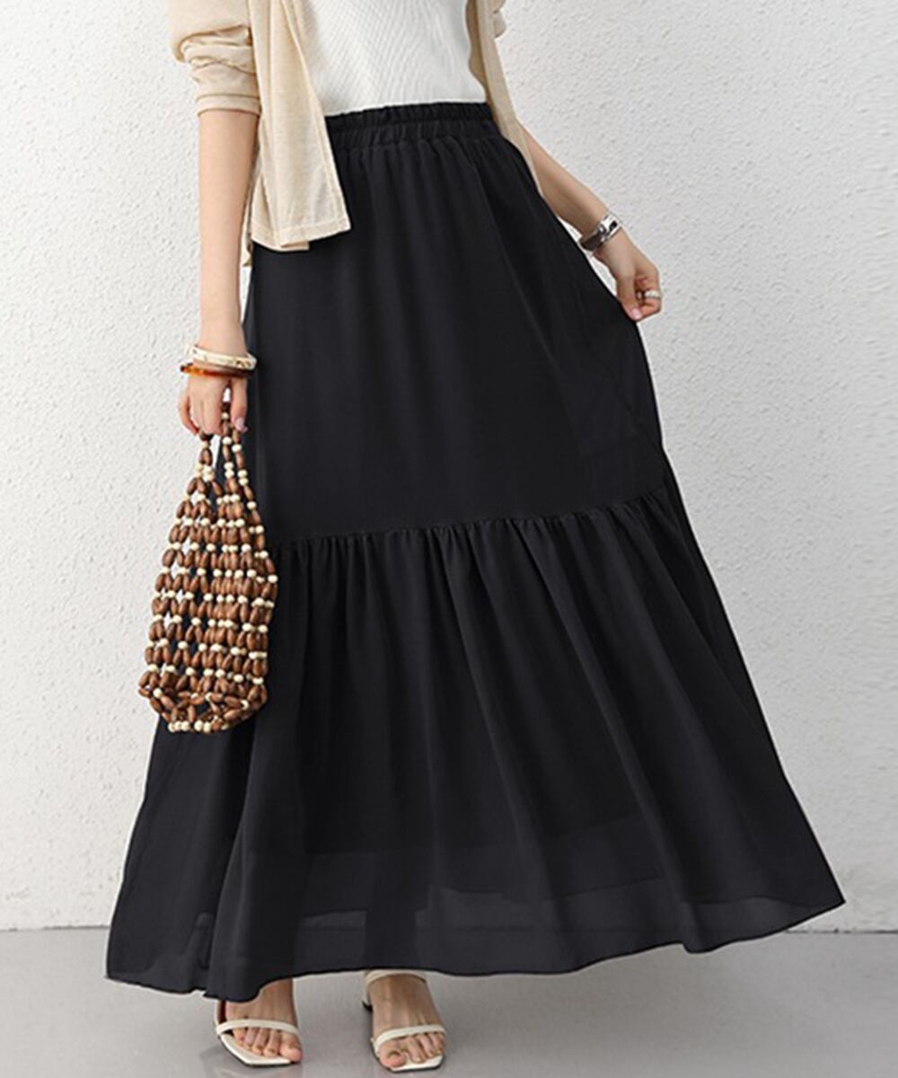 エアリーなシフォン素材が、女性らしさを引き立てるティアードスカート。