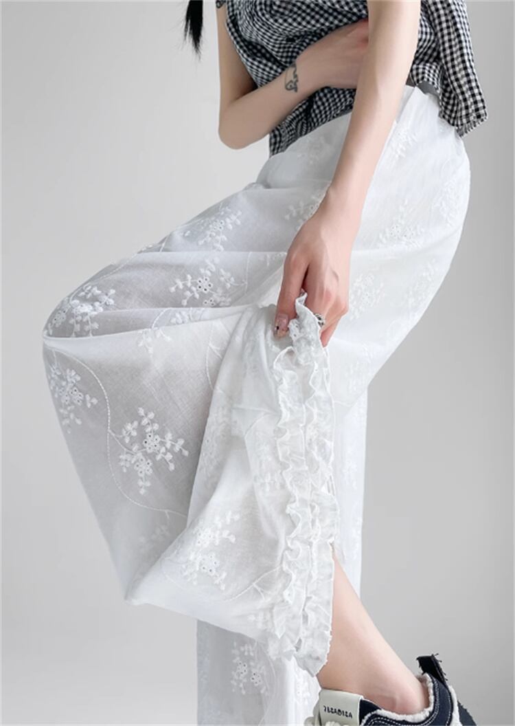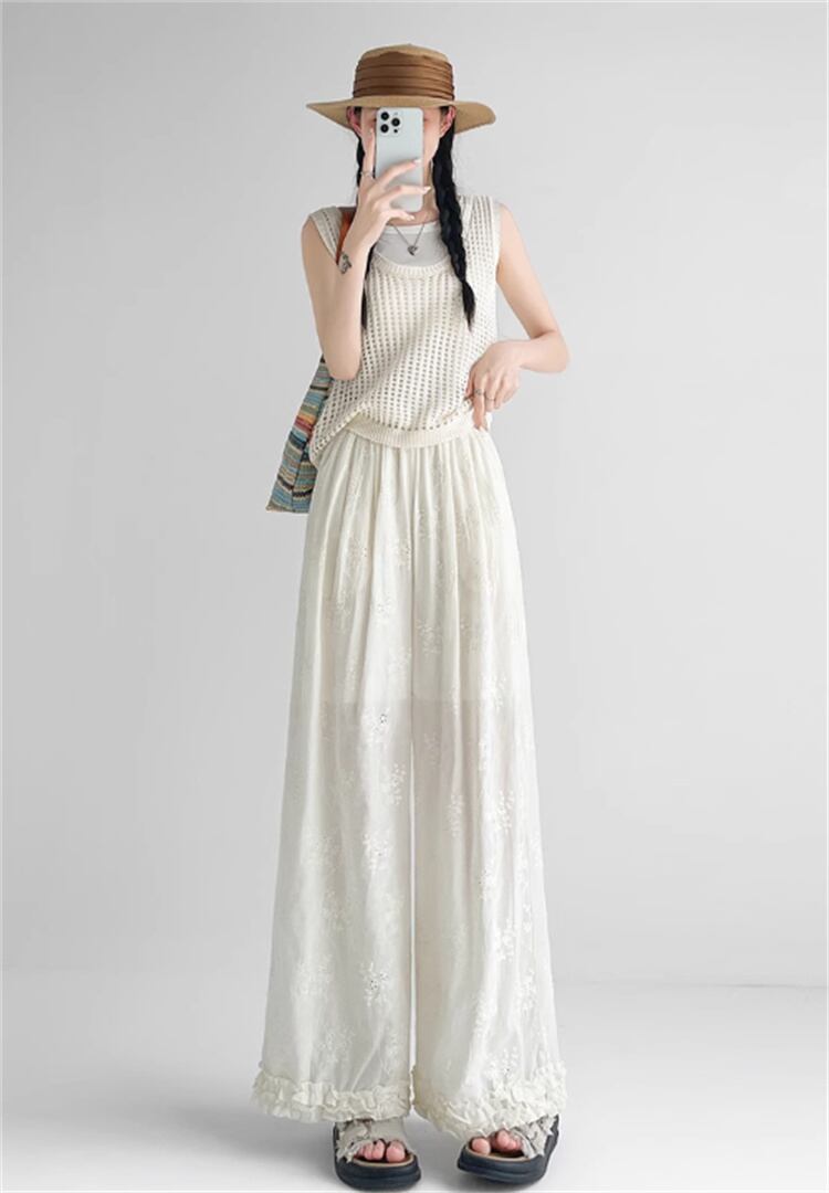 綿麻レース空いたデザインワイドパンツ 高めウエストライン 薄生地で涼しい2025年夏向けロングパンツ