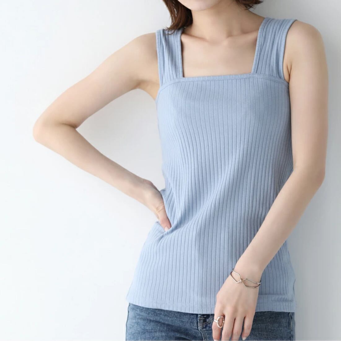 ブラ紐を隠せるリブ素材スクエアネックタンクトップ