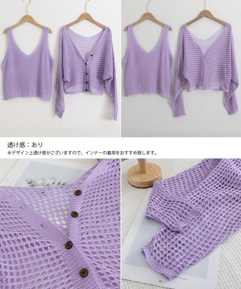 レディース 透かし編み 薄手ニットアンサンブル メッシュカーディガン Vネックタンクトップ セットアップ カジュアル夏服