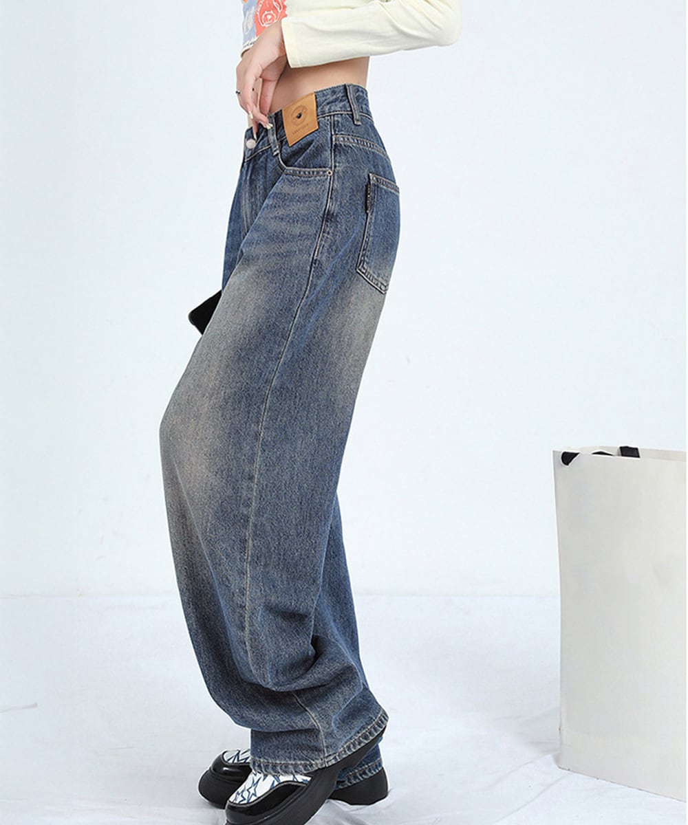 ビンテージ感漂うウォッシュ加工が魅力の、ワイドシルエットデニム。