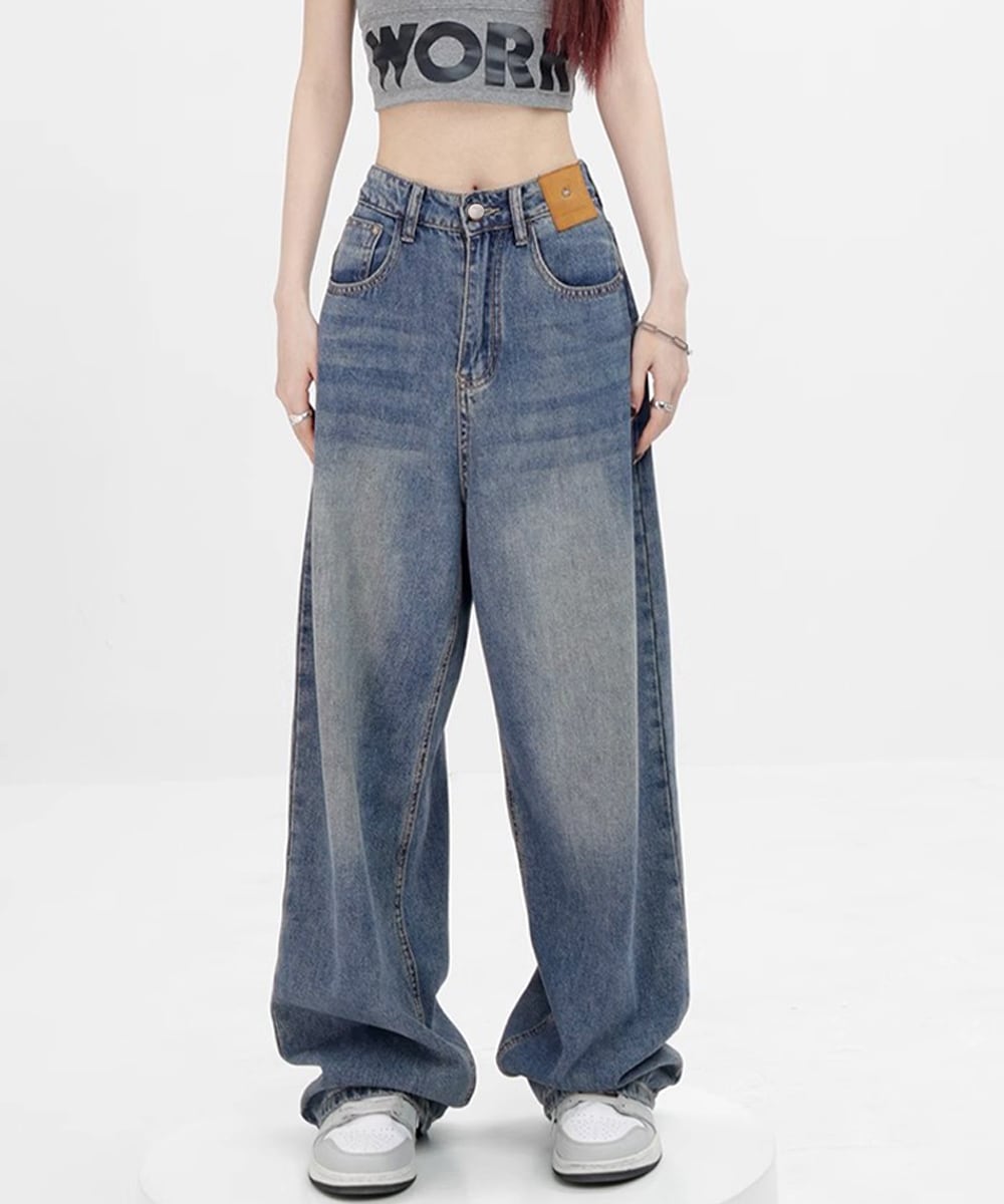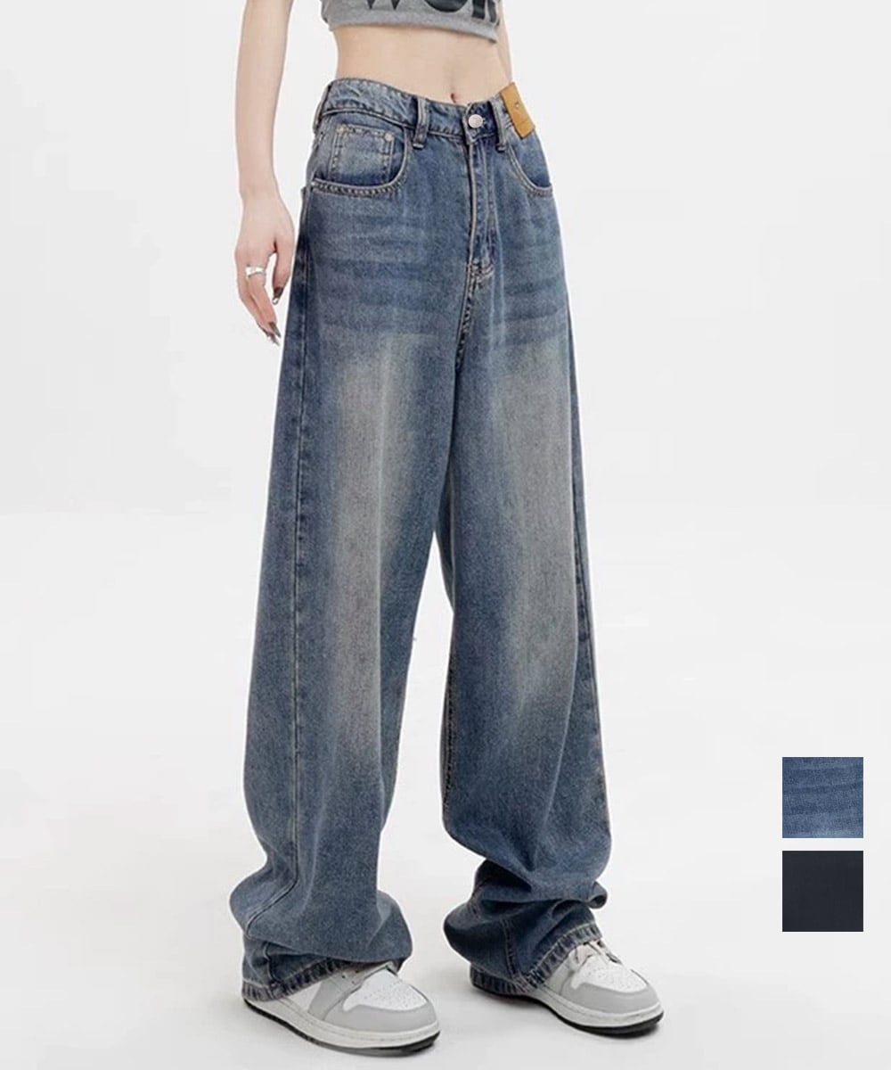 レディース レトロ風ジーパン ワイドレングス ウォッシュデニム 脚長 ストレートデニム ゆったり 色落ちジーンズ 韓国風