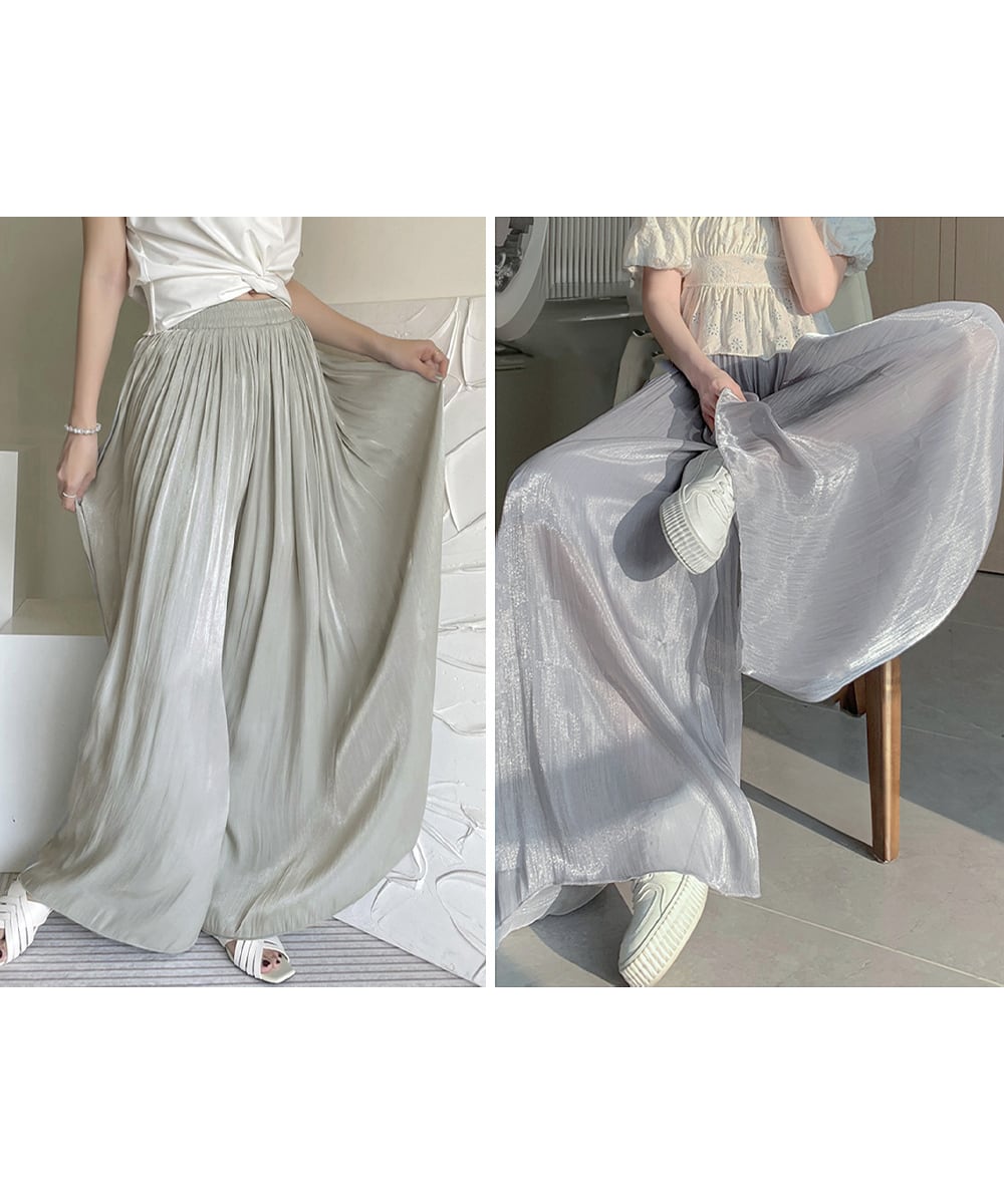 春夏に映える、なめらかな光沢感が魅力のシアーワイドパンツ。