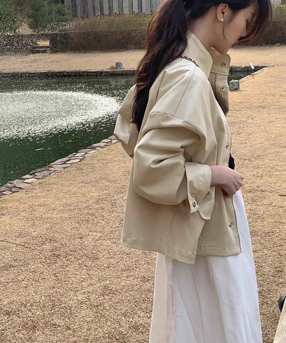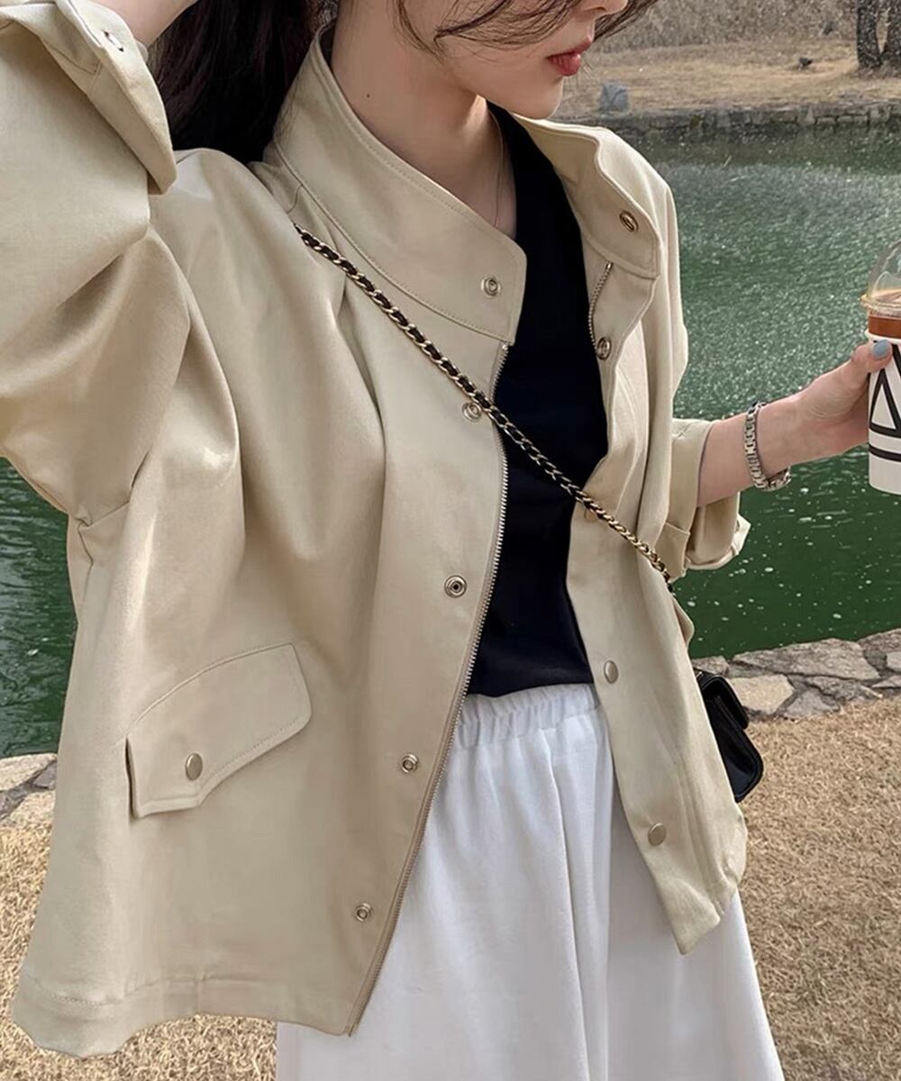 Tシャツやワンピに羽織るだけでスタイリッシュに決まるレディース立ち襟ジャケット。