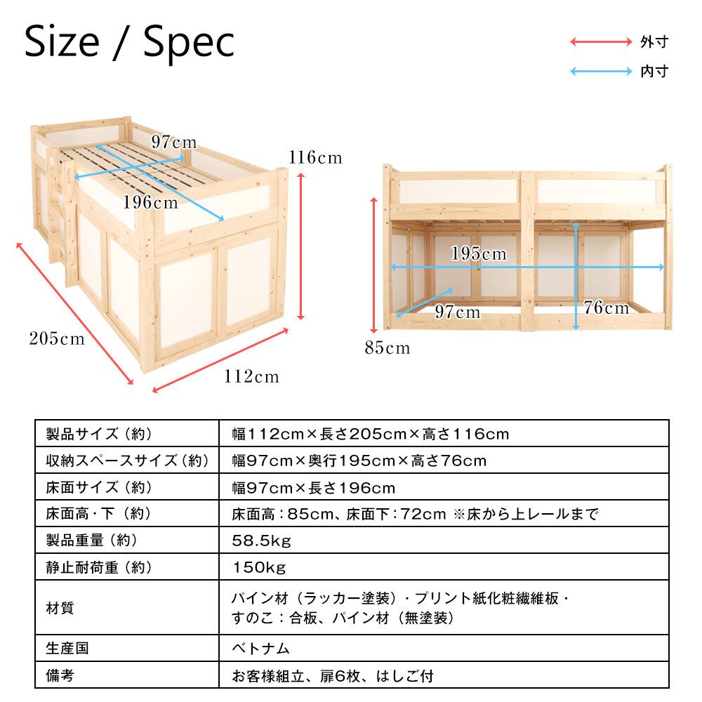 ・収納スペースサイズ:幅97cm×奥行195cm×高さ76cm