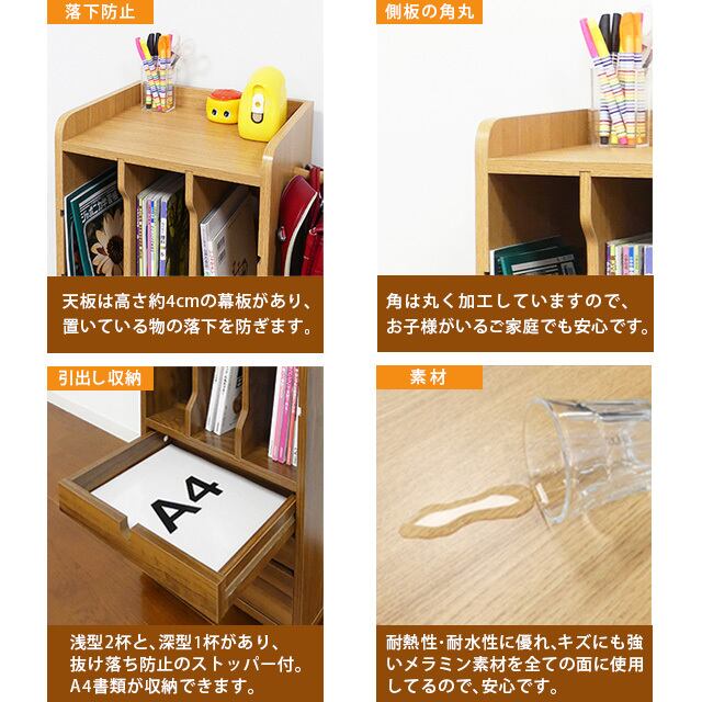 ●引出しは浅型2杯、深型1杯があり、抜け落ち防止のストッパー付。A4書類が収納できます。