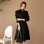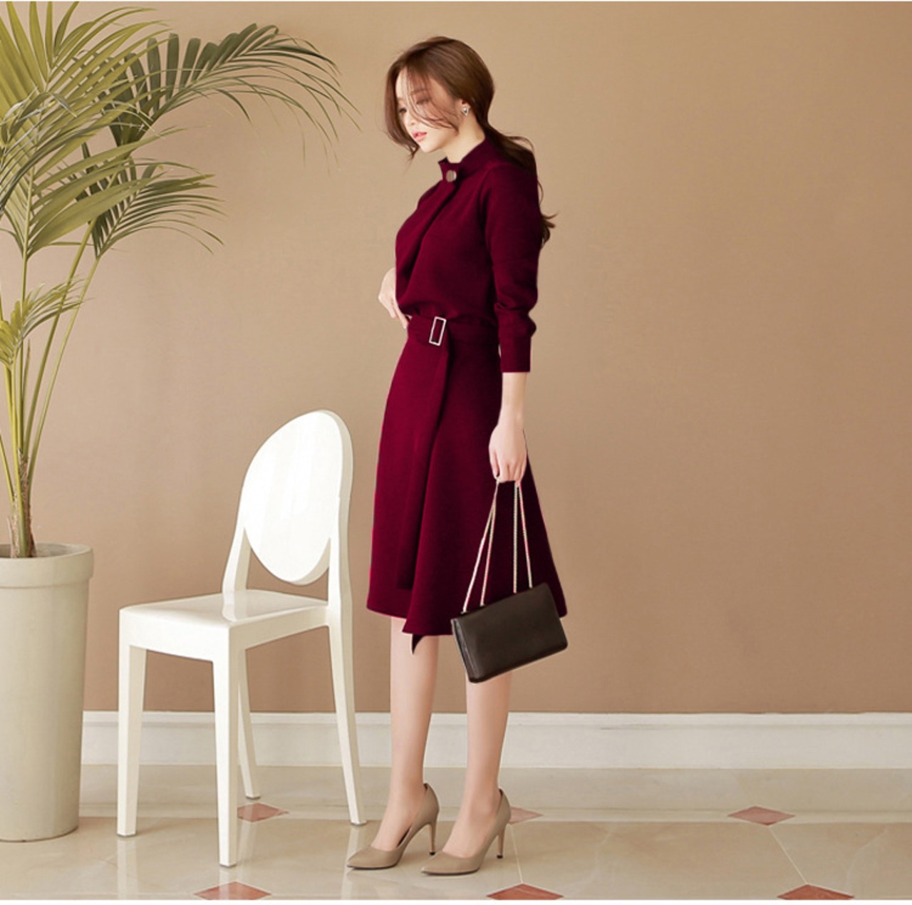 Aラインワンピース レディース 黒 ワイン スリット入り ミディアム丈 膝丈 ひざ丈ワンピース 2025新作