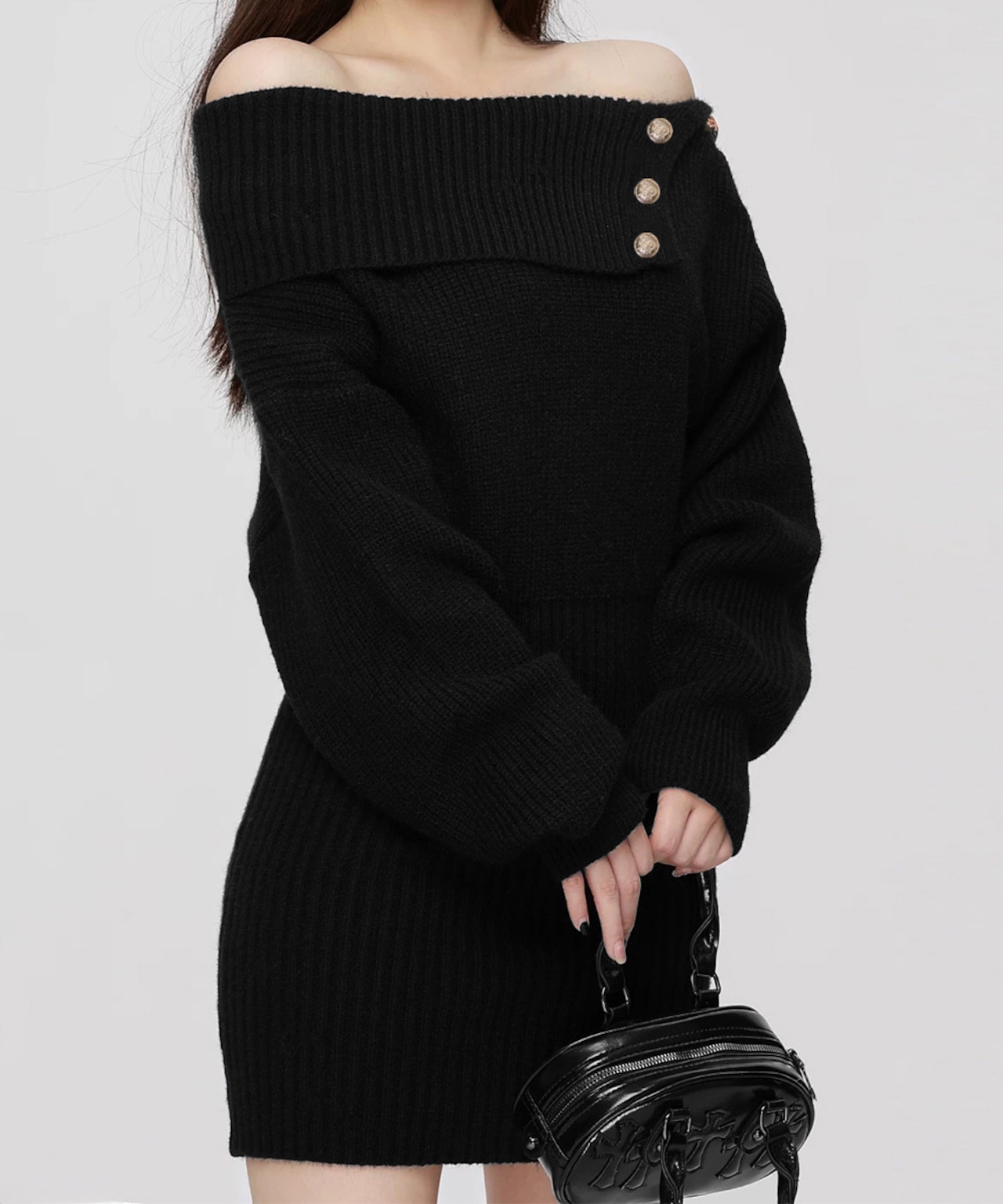 トレンドのオフショルダーに金ボタンデザインを施した、上品な雰囲気漂うニットワンピース。