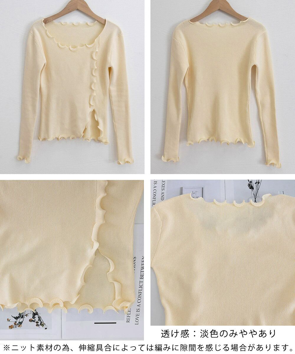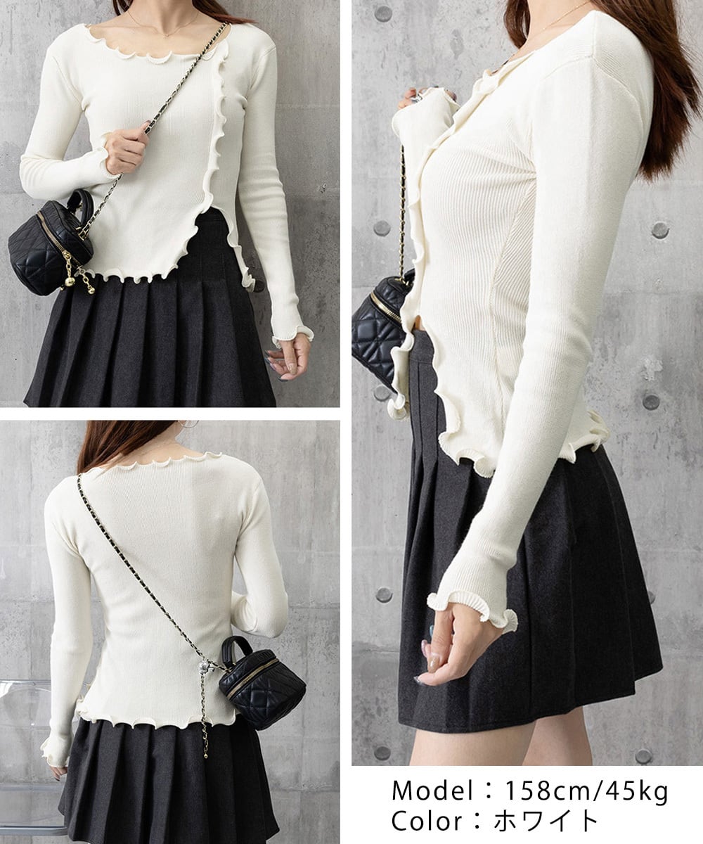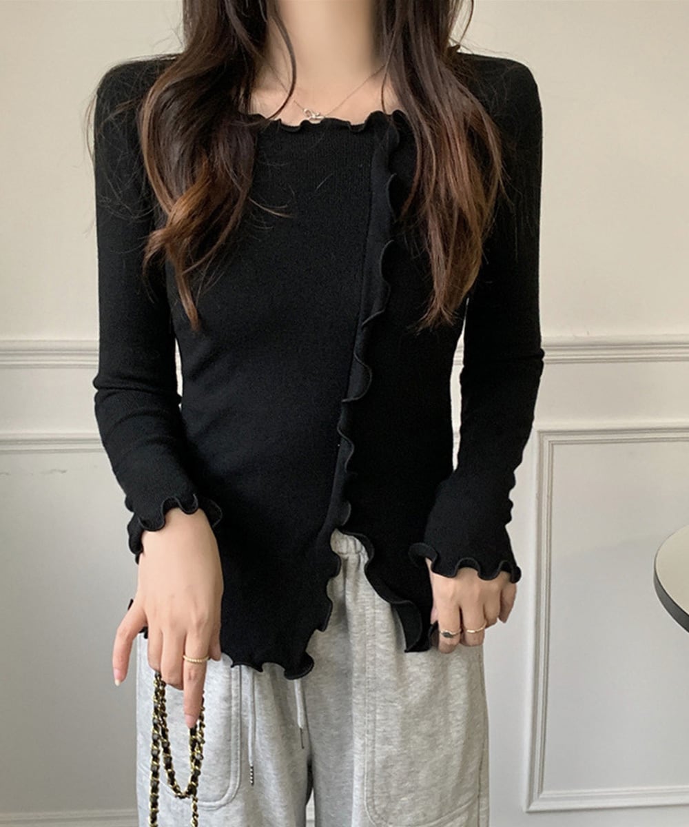 フリルをあしらった縁取りが印象的な長袖ニットトップス。