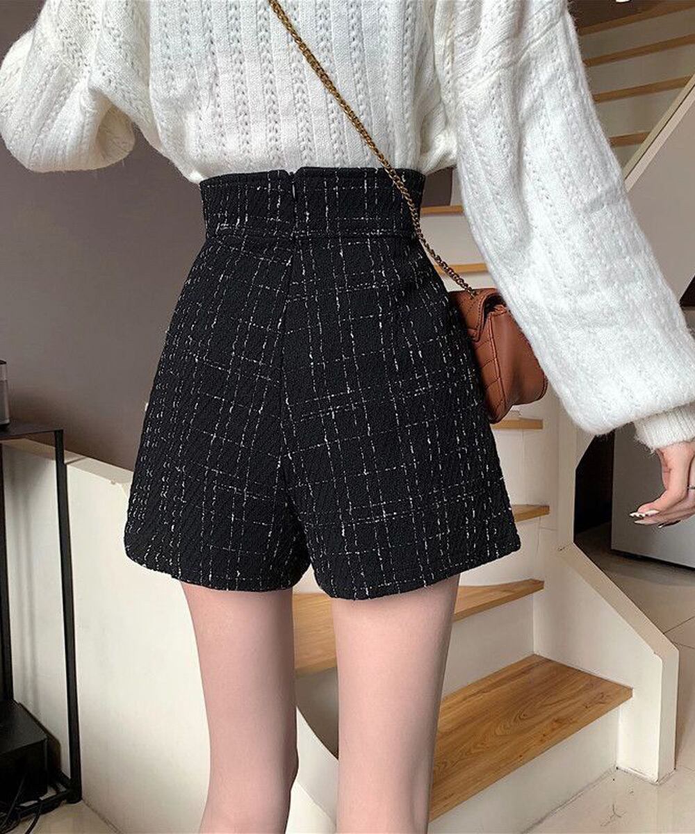 ツイード調のチェック柄が上品な印象を与えるハイウエストのラップ風ミニスカパン。