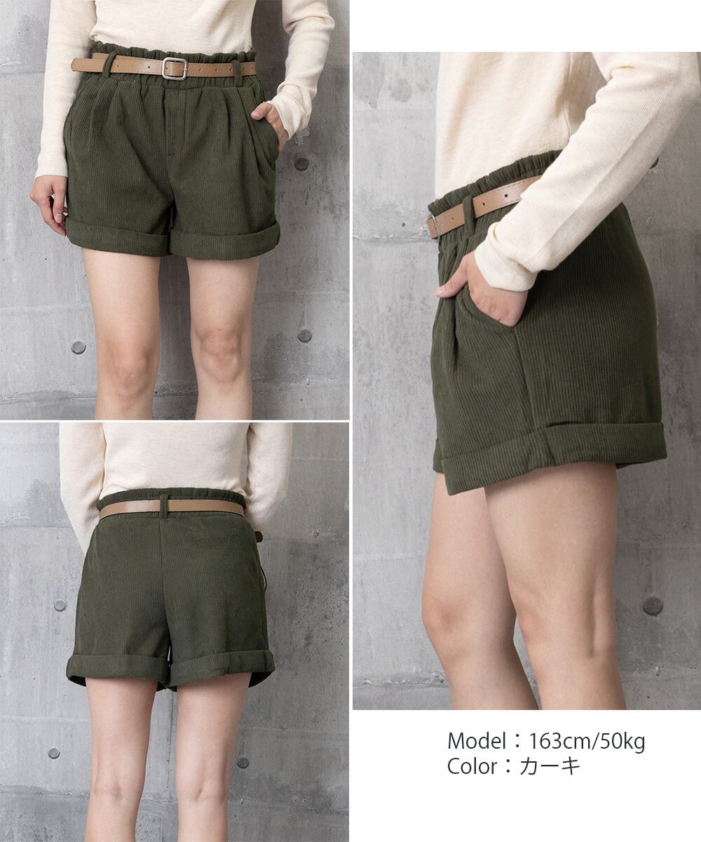 ハイウエストデザインとAラインシルエットで、脚長印象とスタイルアップを引き立てるベルト付きコーデュロイショートパンツ。