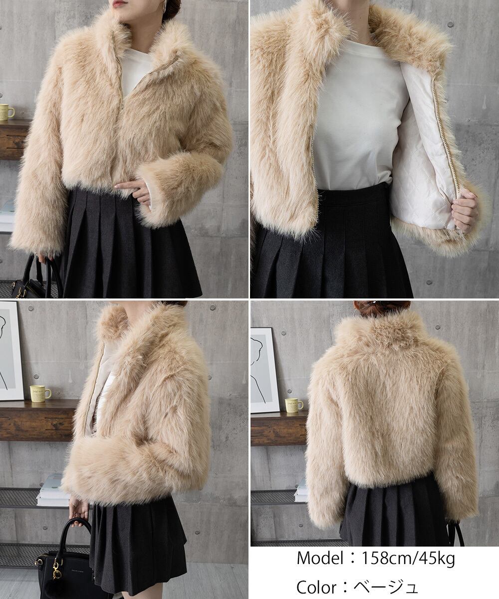上質なフェイクファーを使用した、ショート丈のスタンドカラージャケット。
