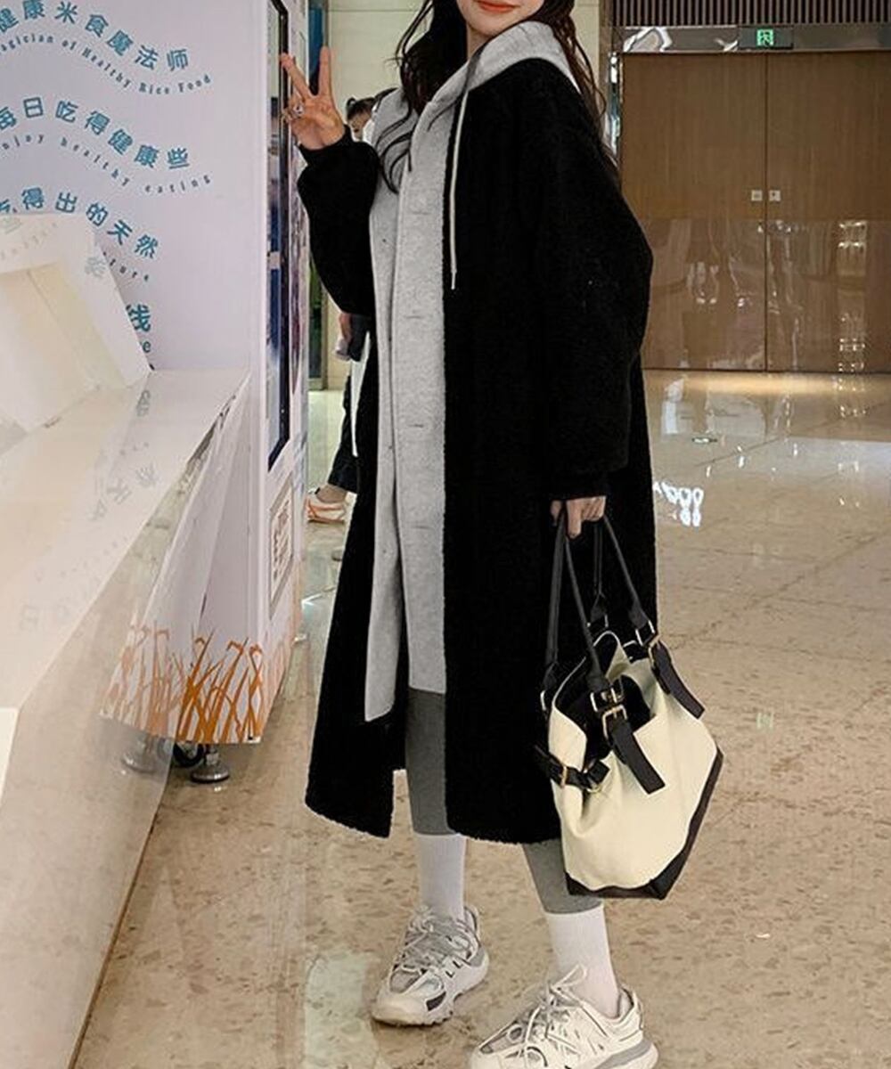 まるで中にパーカーを着ているかのようなレイヤードスタイルのボアロングコート