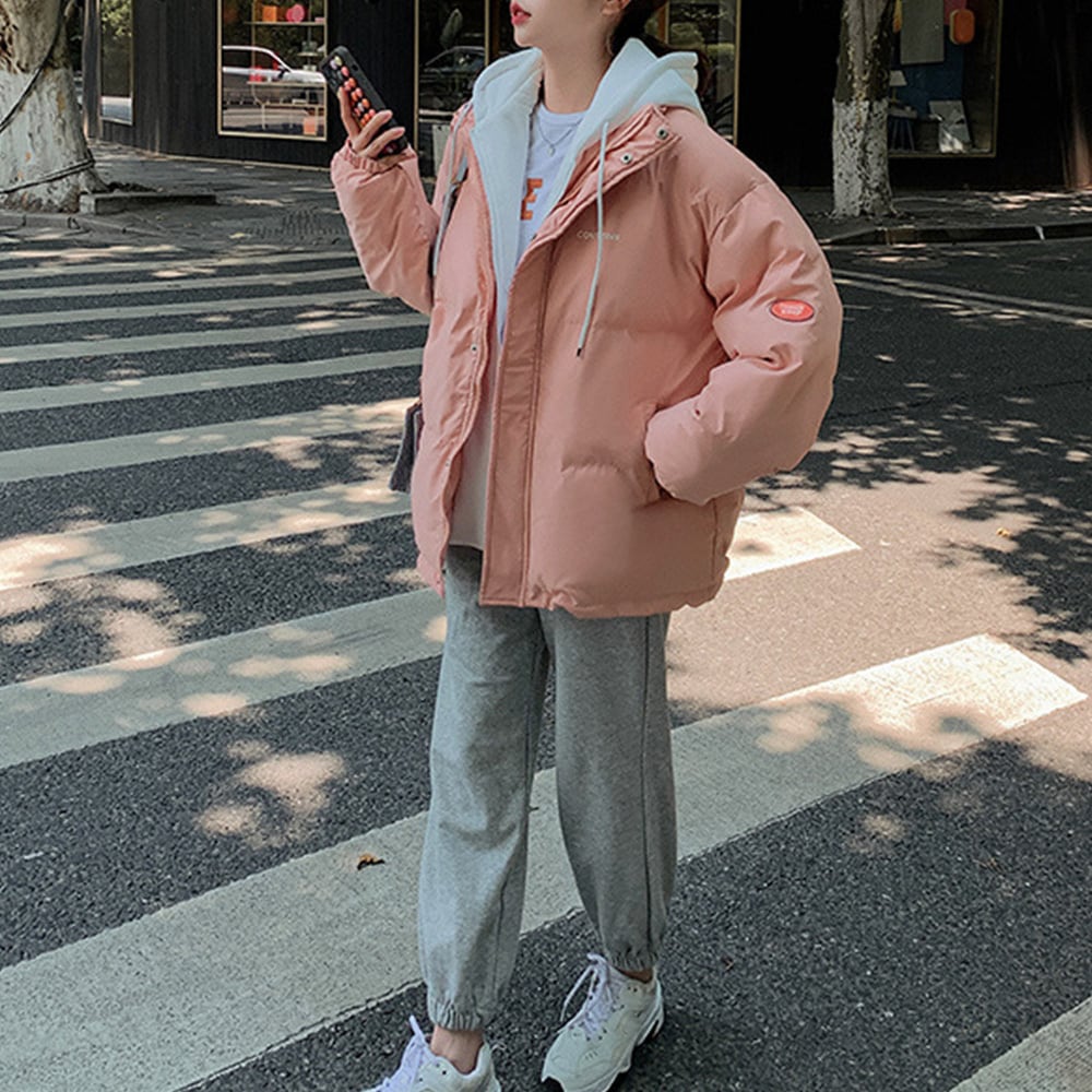 韓国風 フード付き 中綿コート レディース ロゴ 防寒アウター あたたか ジャンパー フェイクダウン ブルゾン