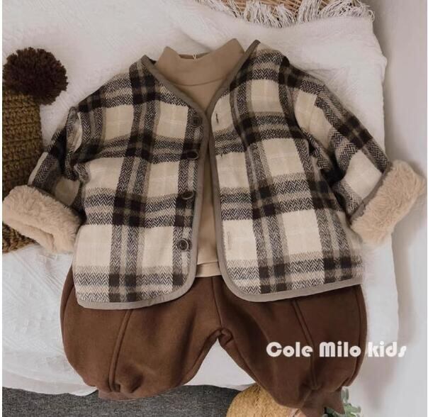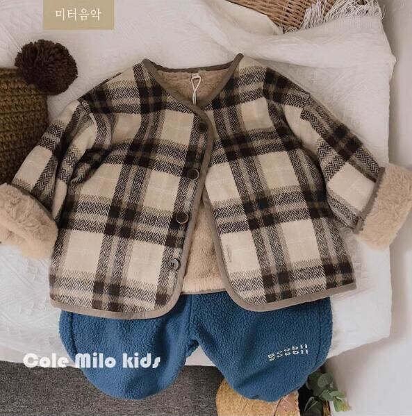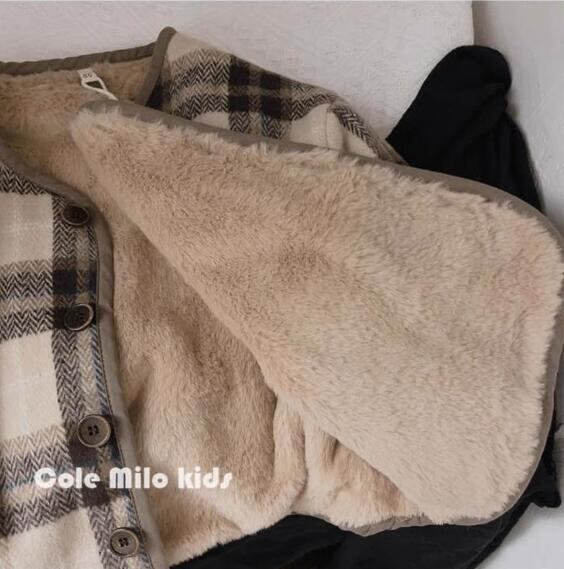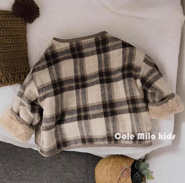 柔らかな覆毛素材を使用し、寒い季節にもぴったりの暖かいアウターです!チェック柄が可愛さを引き立て、どんなお出かけにも大活躍します。お子様にぴったりのスタイルで、可愛らしさと機能性を兼ね備えています!