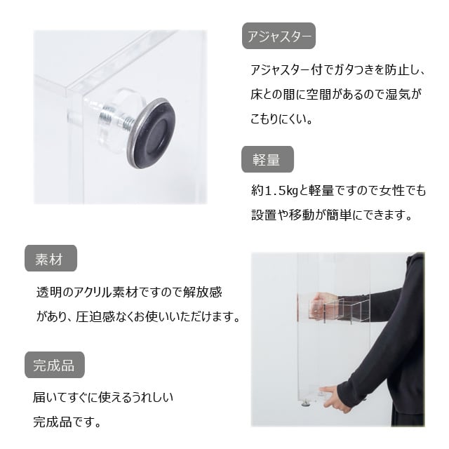 ●透明のアクリル素材ですので解放感があり、圧迫感なくお使いいただけます。
