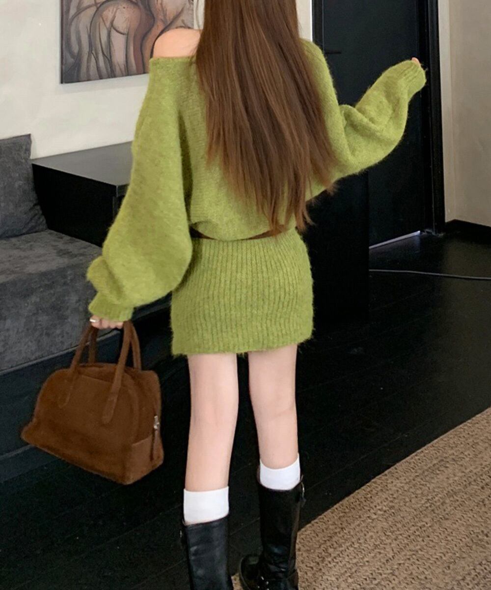 トップはボリュームスリーブで華奢見え、スカートはリブ編みで脚まわりをすっきり見せるシルエット。