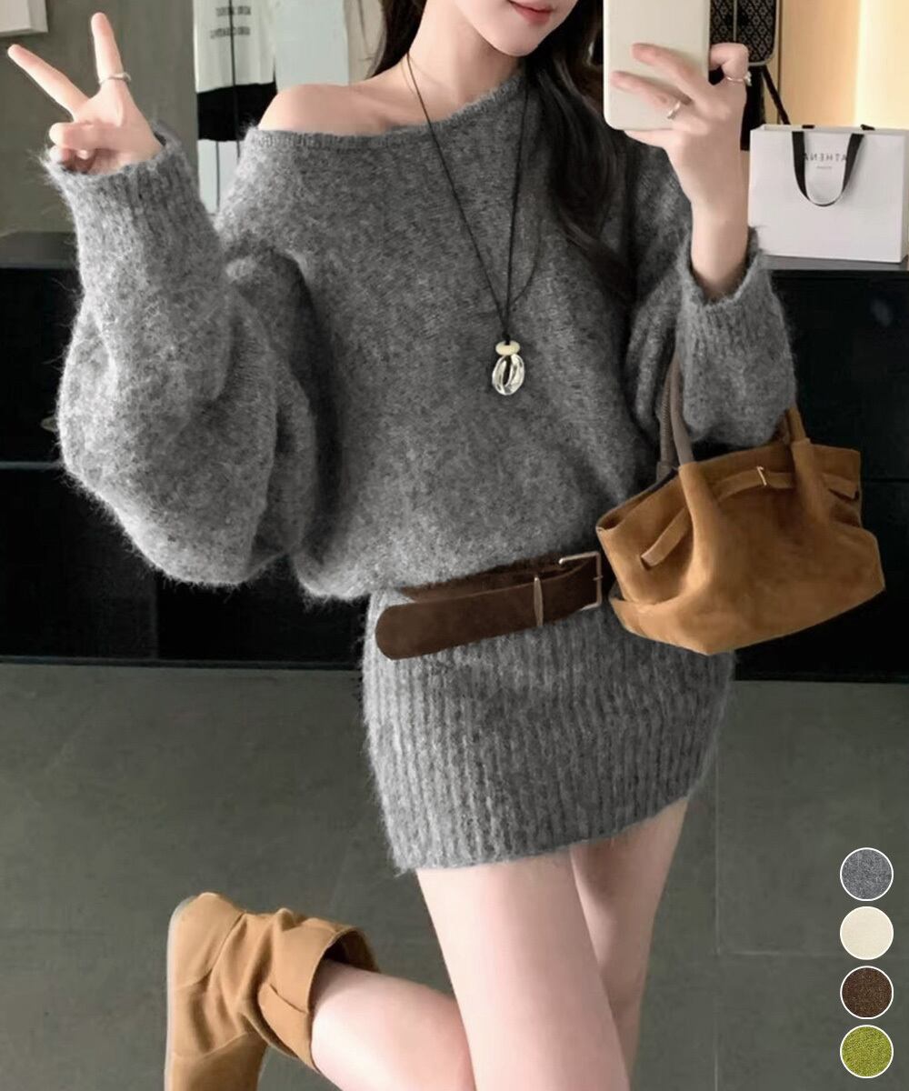 ベルト付きリブワンピース レディース タイトシャギーミニワンピース チュニックワンピ秋冬長袖 オフショルダーワンピ着やせ