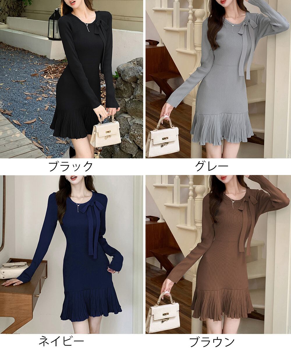 胸元のリボンと裾のプリーツフリルがアクセントの長袖リブニットワンピース。