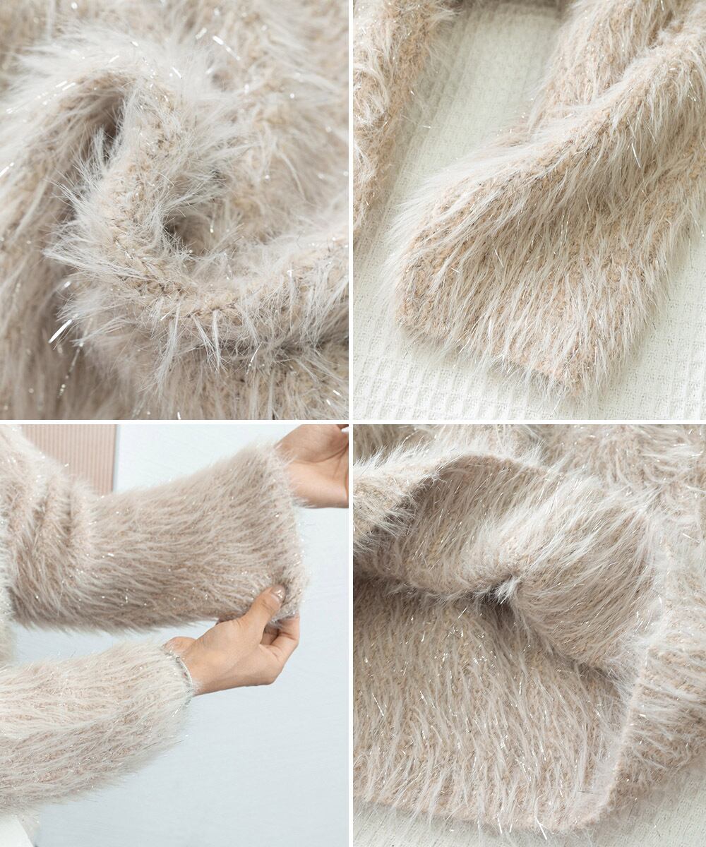 暖かみのある、ふんわり柔らかな長毛シャギー素材を使用したニットトップス