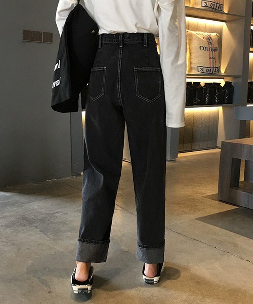 ウエストボタンでサイズ調節OK!ハイウエスト×ストレートの美脚デニムパンツ。