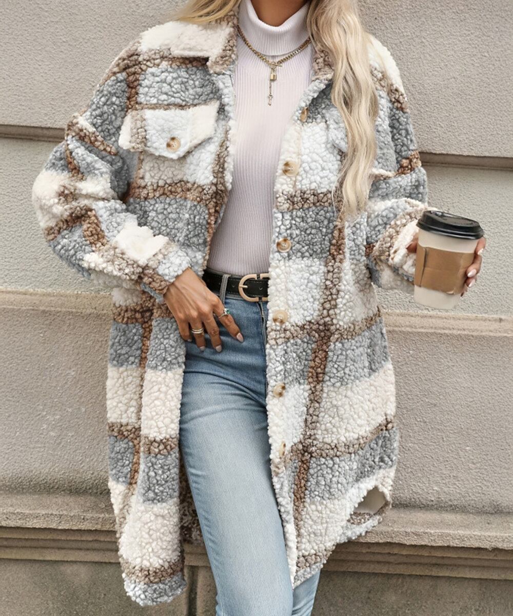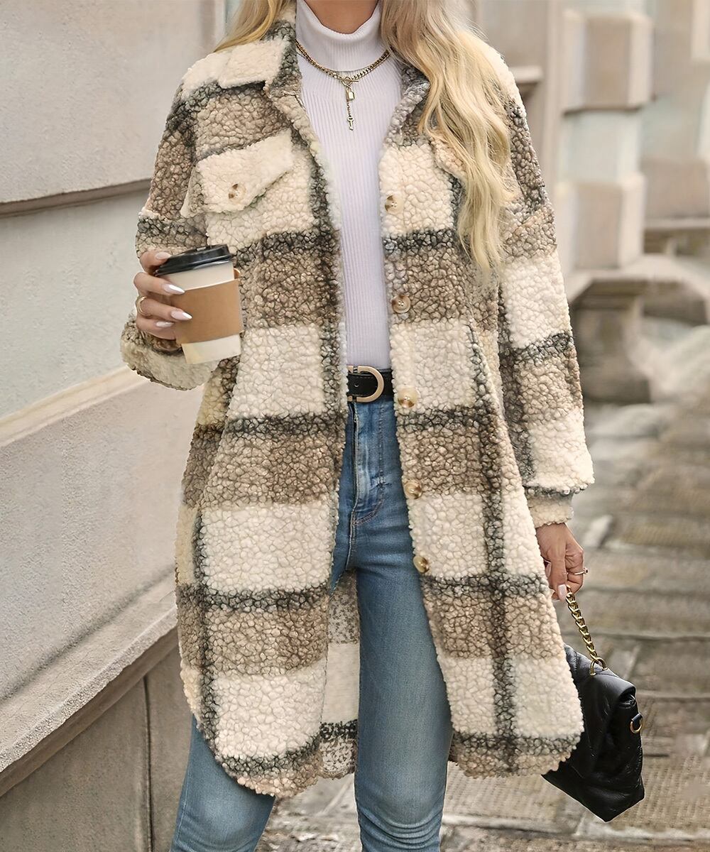 チェック柄のもこもこボアが目を引くロングシャツジャケット。