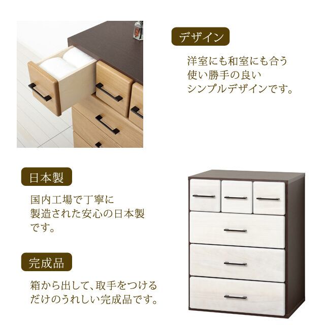 ●引出しは大小各3杯付で小物から衣類までたっぷり収納できます。