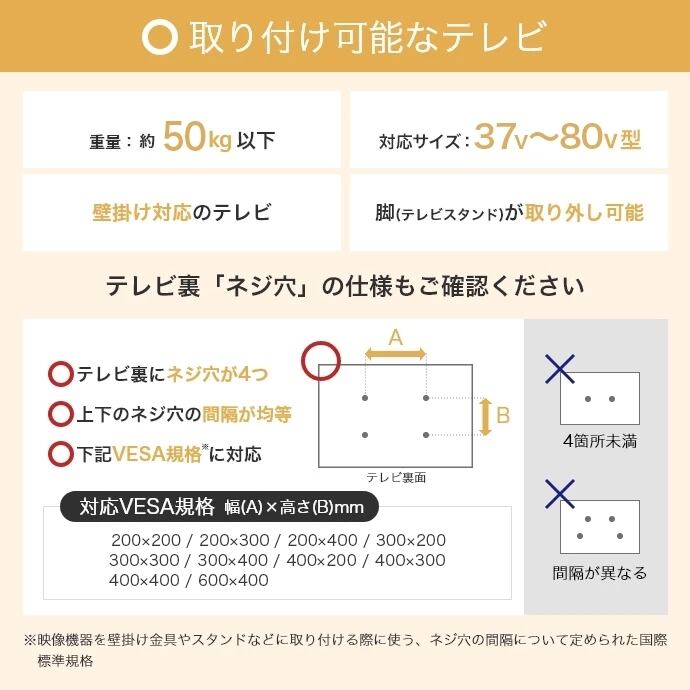 ※37~80型テレビのVESA規格に対応しています。