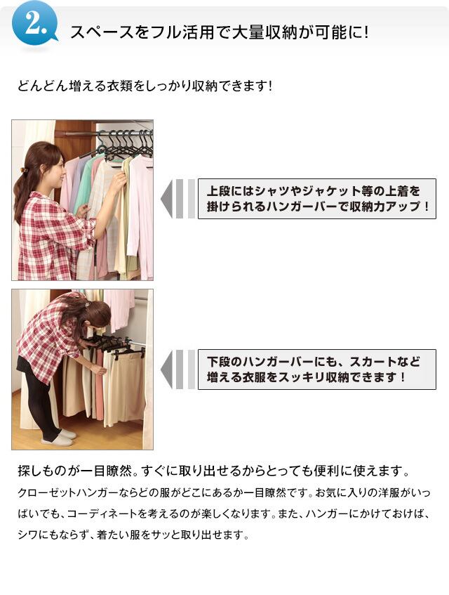 ●中段にスーツやジャケット等が掛けられるハンガーバーが付いてさらに収納力がアップ!