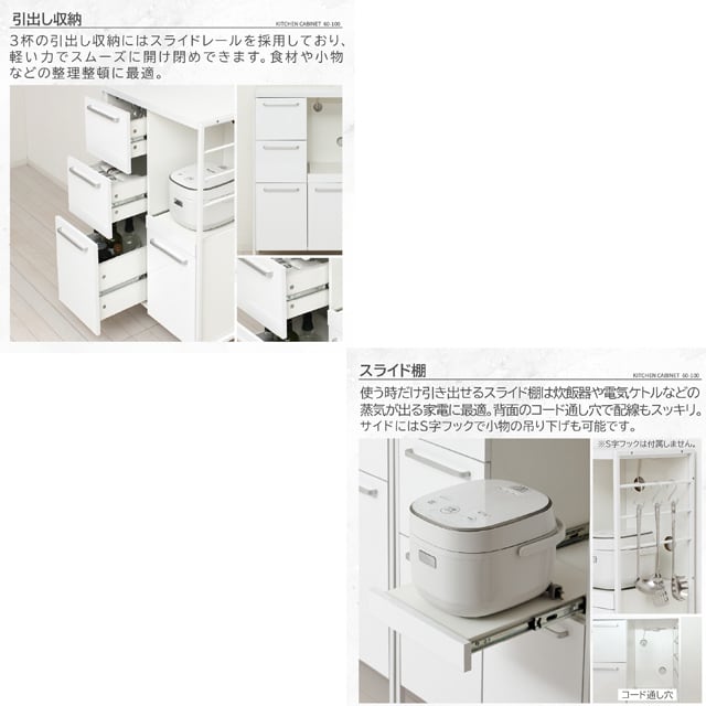 ●引出しとスライド棚は、スライドレールで出し入れラクラク。