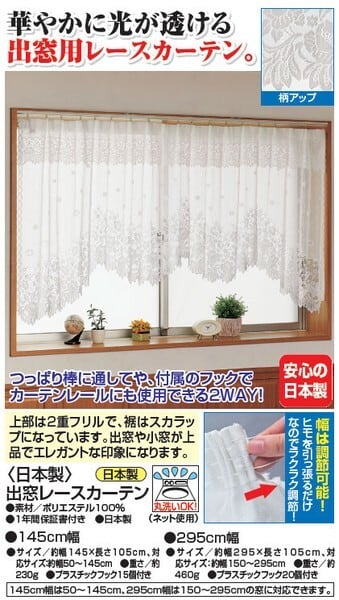 ●上部は2重フリルで、裾はスカラップになっています。出窓や小窓が上品でエレガントな印象になります。