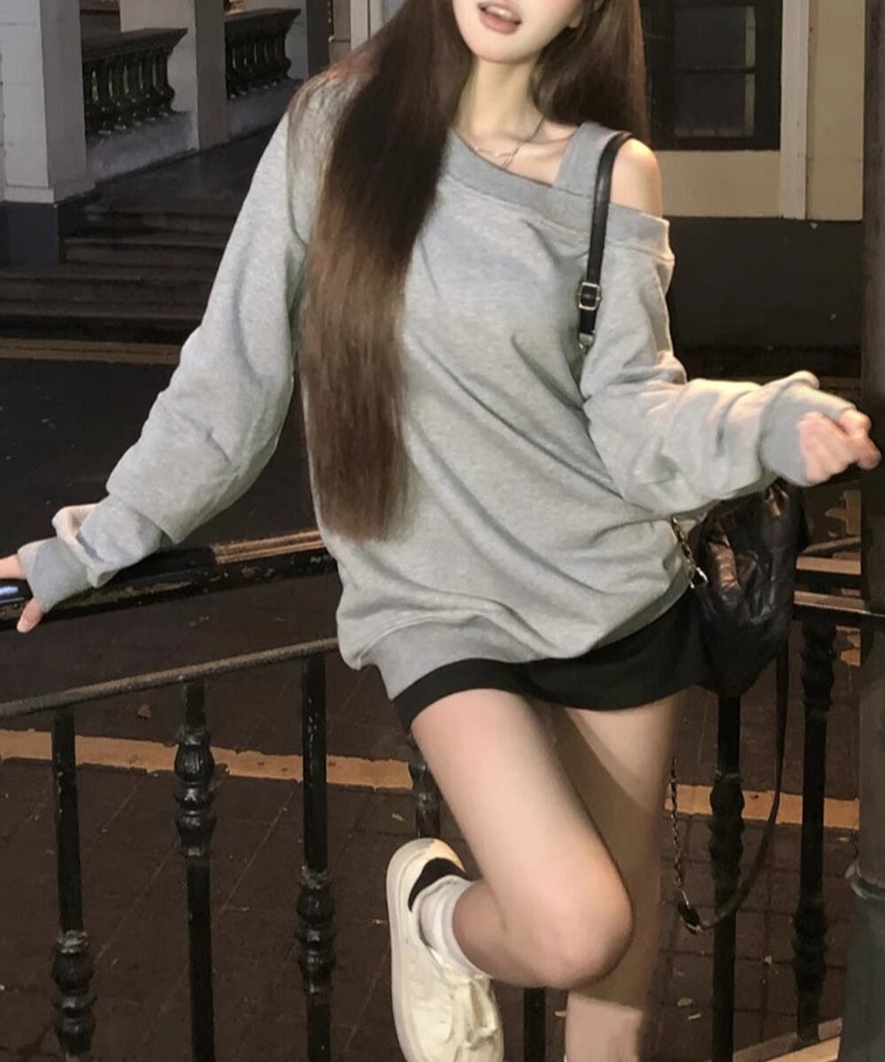 ゆるトップスお洒落/肌見せトレーナー黒/無地ロンT 春秋服