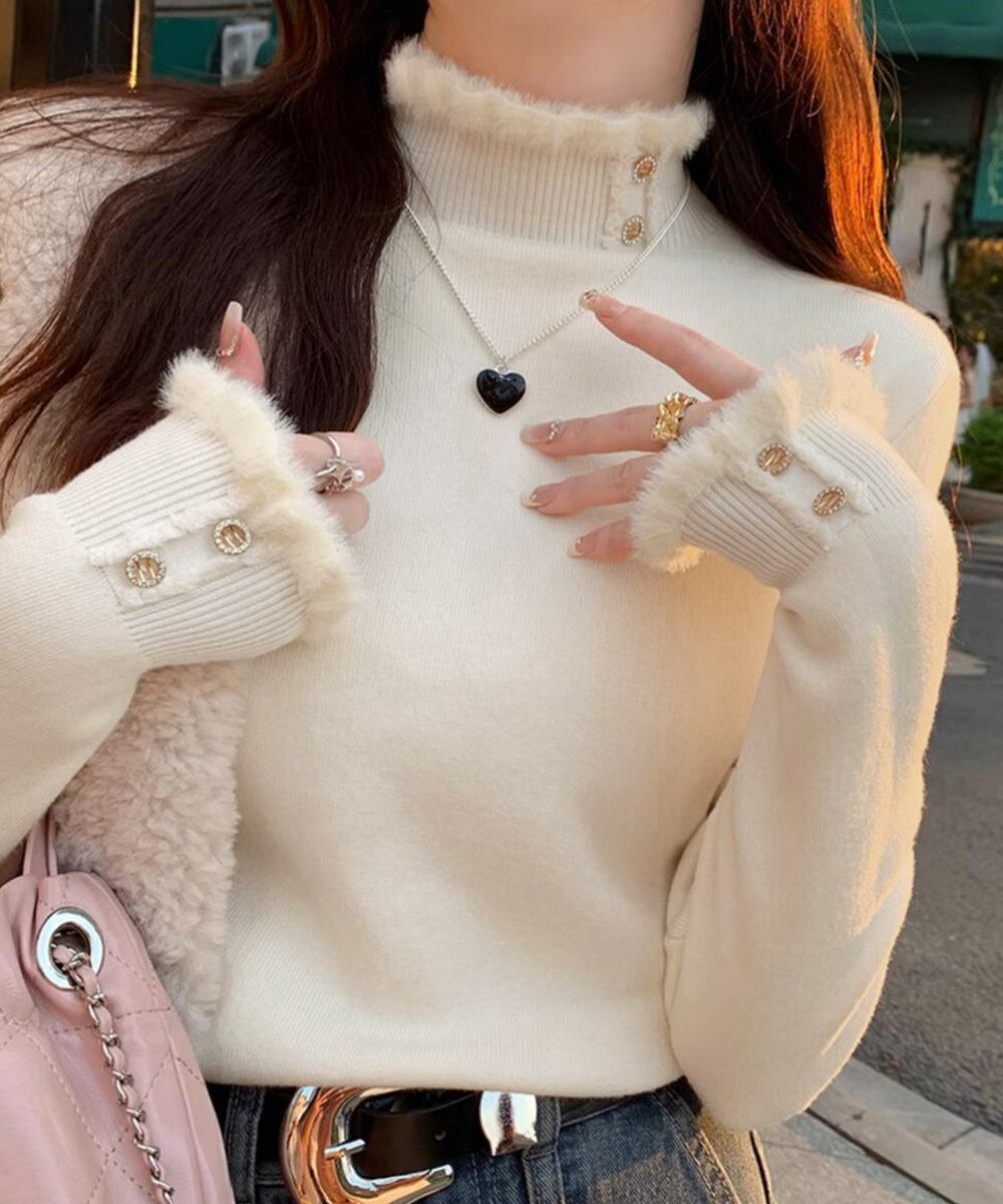 裏ファーニット防寒 フリルネックニット オフィスカジュアル