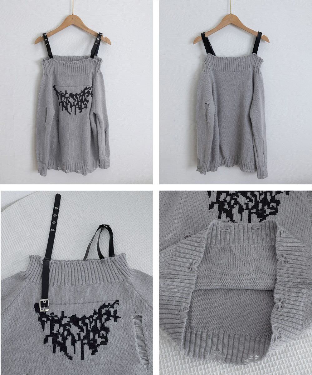 肩見せニットチュニックレディース レザー調肩紐ニットワンピース フロントグラフィティニットトップス ゆったりY2Kニット