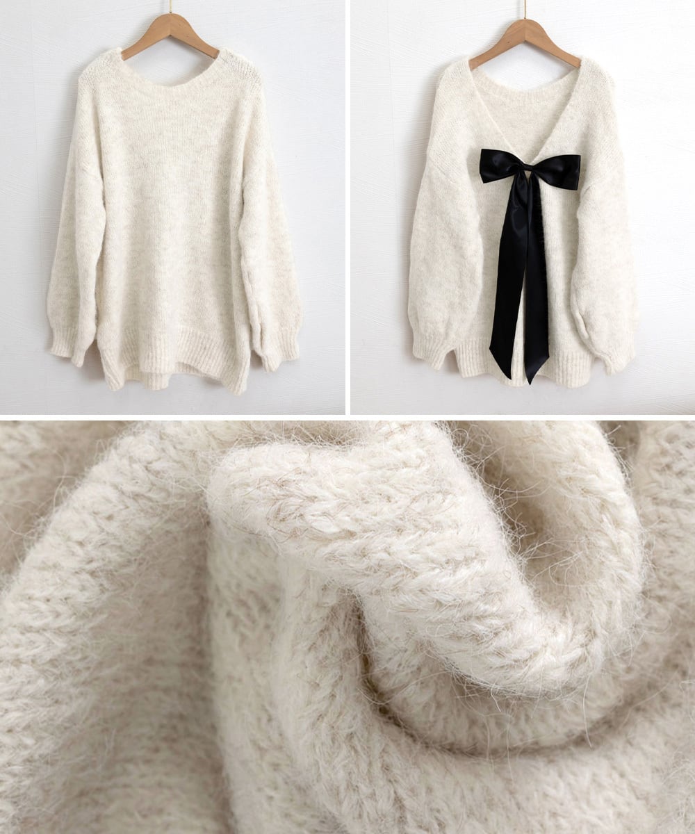 ビッグリボンタイニットプルオーバー 大人可愛いニットトップス リボン付きセーター おしゃれ春服 ゆったり甘めニット肌見せ