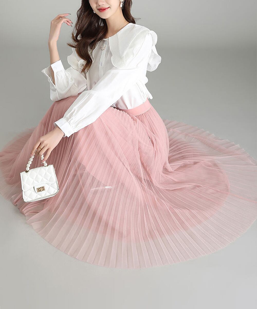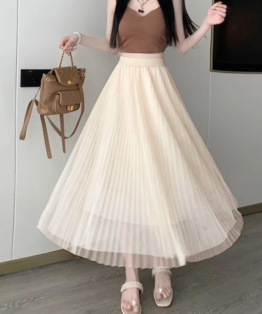 軽やかなチュール素材を使用した、プリーツデザインのロングスカート。