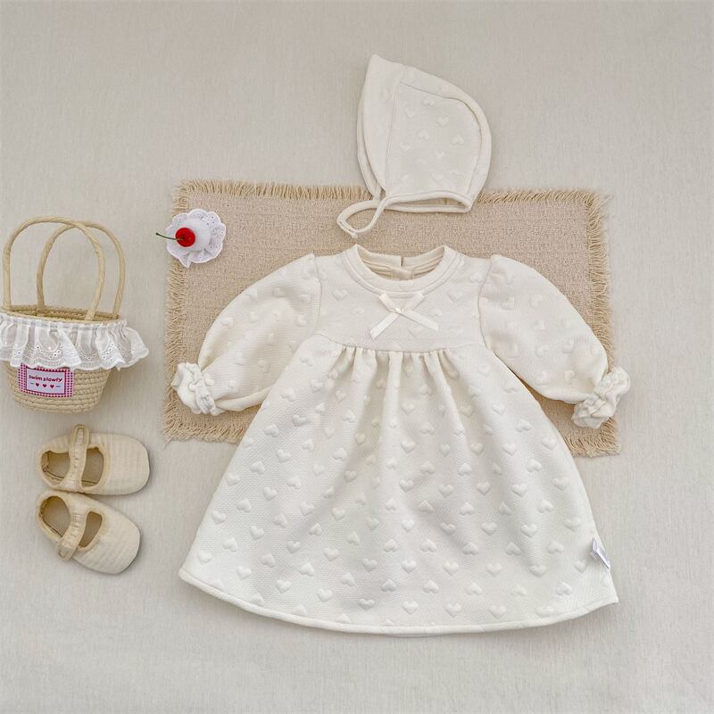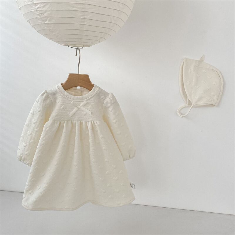 子供服 ジャカード ハート柄 長袖 ワンピース 可愛い 帽子付き 女の子 おしゃれ