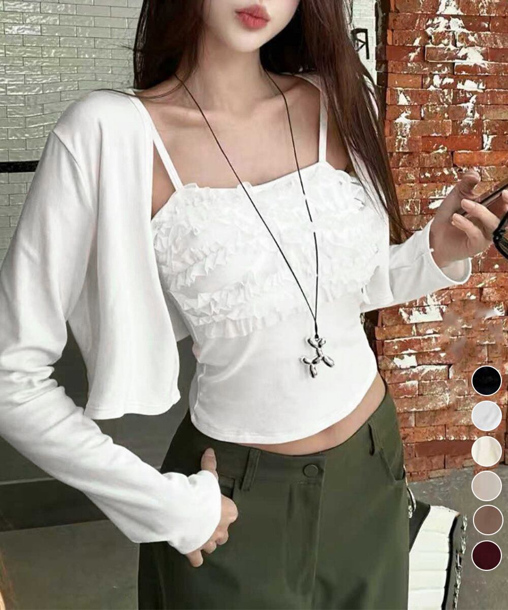 レディースインナーフリルキャミソールカップ付き おしゃれショートカーディガン長袖 大人可愛い2点セット きれいめ服韓国風