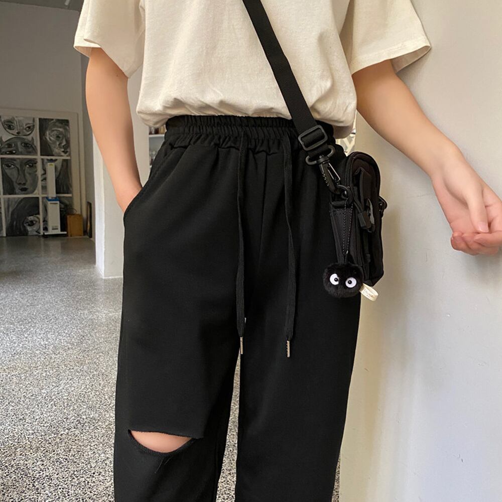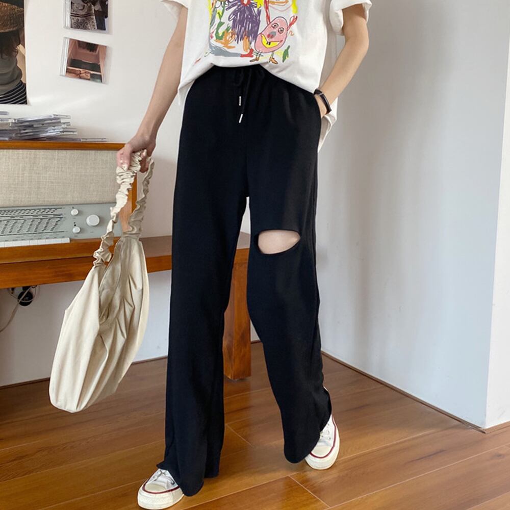 韓国 穴あき スエットロングパンツ ウエストゴム イージーパンツ カジュアル リラックス ストレートパンツ 着やせ